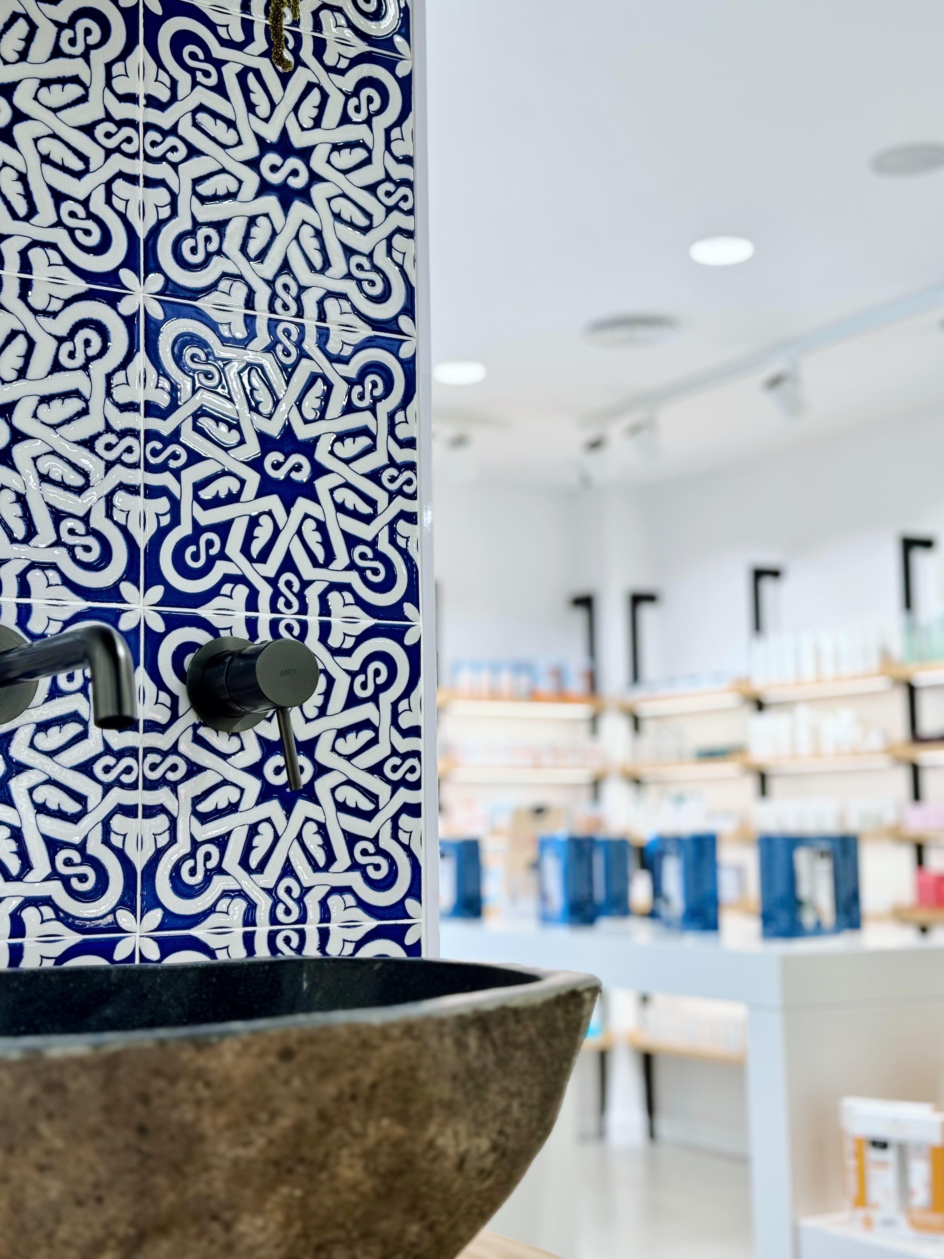 We integrated immersive design principles throughout the pharmacy space. The use of dynamic tiles creates a seamless journey that guides customers through the space, drawing them into different experiences, much like an unfolding narrative. The colours, the textures, the patterns, everything serves to create a multi-sensory experience that’s both cozy and forward-thinking.