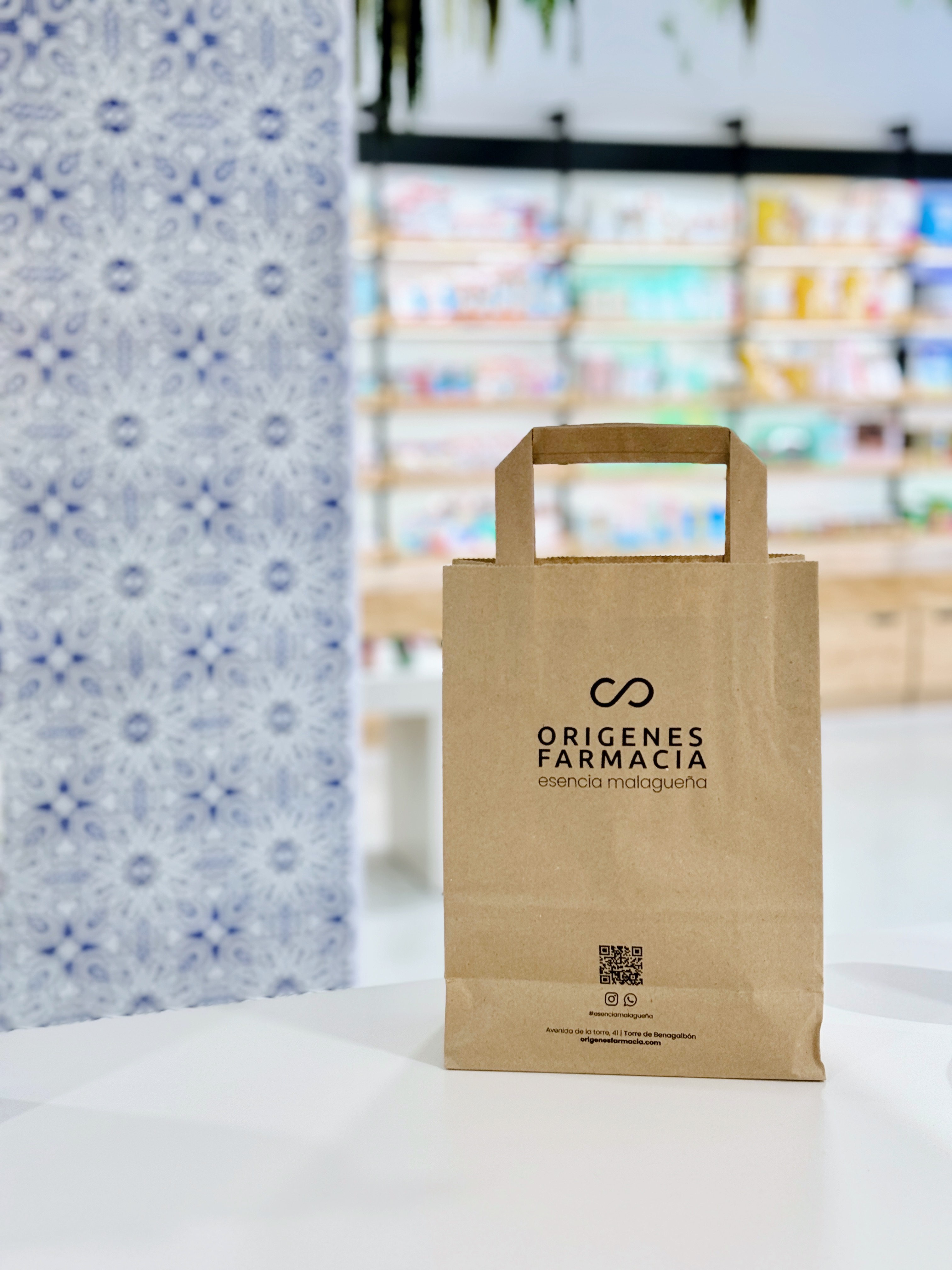 Si bien el “azulejo malagueño” es el motivo central del diseño, nuestro enfoque hacia la personalización y el diseño a medida asegura que cada pieza de la marca, desde su logotipo hasta su packaging, cuente una historia única y coherente. Este es el poder de la personalización, ser único, referente y memorable. En un sector donde muchas farmacias ofrecen soluciones y diseños estándar. La tipografía personalizada, los materiales cuidadosamente elegidos y el diseño del layout aseguran que ‘Orígenes’ no sea solo un lugar, sino una marca viva que se adapta y resuena con cada cliente.